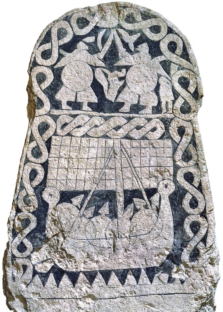 Emblématiques de la Scandinavie, 600 stèles sont aujourd’hui référencées. Celles de l’île de Gotland (datées entre 400 et 1100) sont les seules à représenter des navires. On observe un bateau typiquement scandinave avec son fond plat, sa voile rectangulaire, sa proue et sa poupe relevées. Smiss, Gotland, 750-Xe siècle, calcaire, 125 x 65 cm. Stockholm, Statens Historiska Museum. © akg-images / Erich Lessing