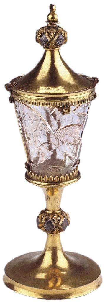 Ce gobelet d’un grand raffinement est un verre taillé, sans doute réalisé à la fin du XIIe ou au début du XIIIe siècle ; il a ensuite reçu sa monture actuelle à Oignies, en Belgique, puis fut associé à sainte Edwige. Les analyses de ses composants ont montré que si la matière première (du verre sodique très transparent qui fascinait l’Occident) provient du Levant, l’objet a été confectionné dans les ateliers de Palerme au cœur de la Sicile normande. Son décor mêle diverses influences mais la figuration d’animaux (dont des lions) rappelle les décors monumentaux de la ville et la présence d’une constellation en forme de triangle et de points est une référence explicite à l’île depuis l’Antiquité. Il existe plusieurs objets de ce type ; celui-ci, prêté par la Fondation du roi Baudouin en Belgique, est l’une des sept merveilles belges.