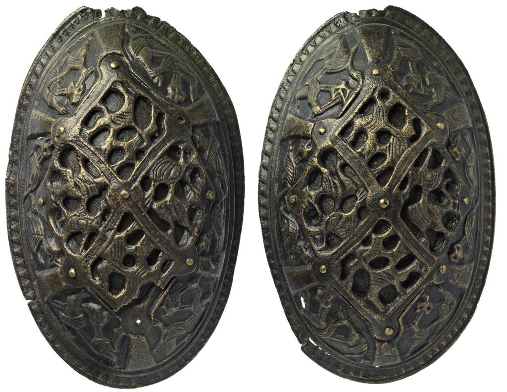 Fibules scandinaves retrouvées à Pîtres, IXe siècle. Alliage cuivreux doré, 11 x 7 cm. Rouen, musée des Antiquités. © RMN, Rouen Normandie, musée des Antiquités