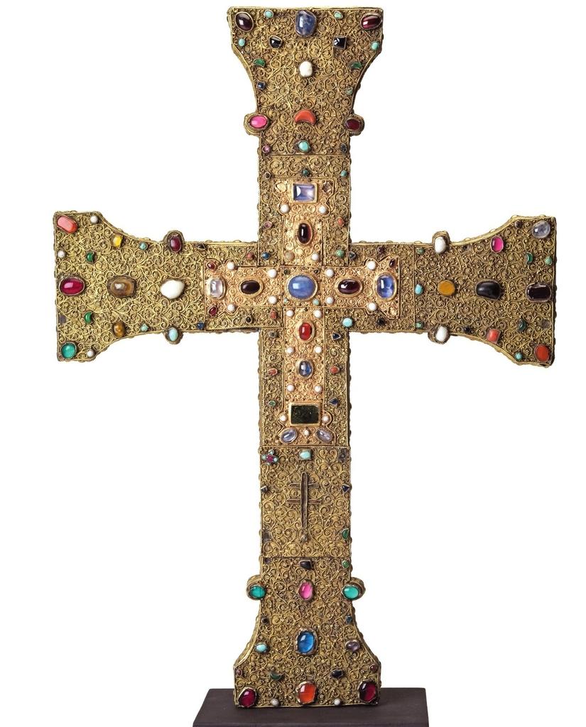 Cette croix-reliquaire provient de l’abbaye cistercienne du Valasse en Normandie. Les analyses ont déterminé que ses gemmes proviennent du monde entier : le lapis-lazuli du Sri Lanka, les grenats de la péninsule indienne, le corail de Méditerranée et la turquoise du Sinaï. Mesurant 46,5 sur 33 cm, elle se compose de deux croix. La plus grande, en argent doré, date de la fin du XIIe siècle (années 1180) et peut être mise en lien avec la consécration de l’abbaye du Valasse, sans doute en présence d’Henri II Plantagenêt (1133-1189). C’est la seule pièce précieuse d’orfèvrerie qui soit parvenue jusqu’à nous en lien direct avec les Plantagenêt (l’autre étant la cuillère du couronnement conservée dans les joyaux de la Couronne à la Tour de Londres et toujours utilisée lors du sacre des souverains britanniques). La petite croix centrale, en or, est plus ancienne : elle remonte au XIe siècle ou au début du XIIe siècle et est plutôt à mettre en lien avec l’orfèvrerie du Saint-Empire romain germanique. On sait que la fondatrice de l’abbaye est la princesse normande Mathilde l’Emperesse, la mère d’Henri II, qui épousa en premières noces l’empereur Henri V. Il est possible que l’impératrice ait rapporté cette pièce (et la relique de la croix qu’elle contient) du Saint-Empire romain germanique en Normandie.