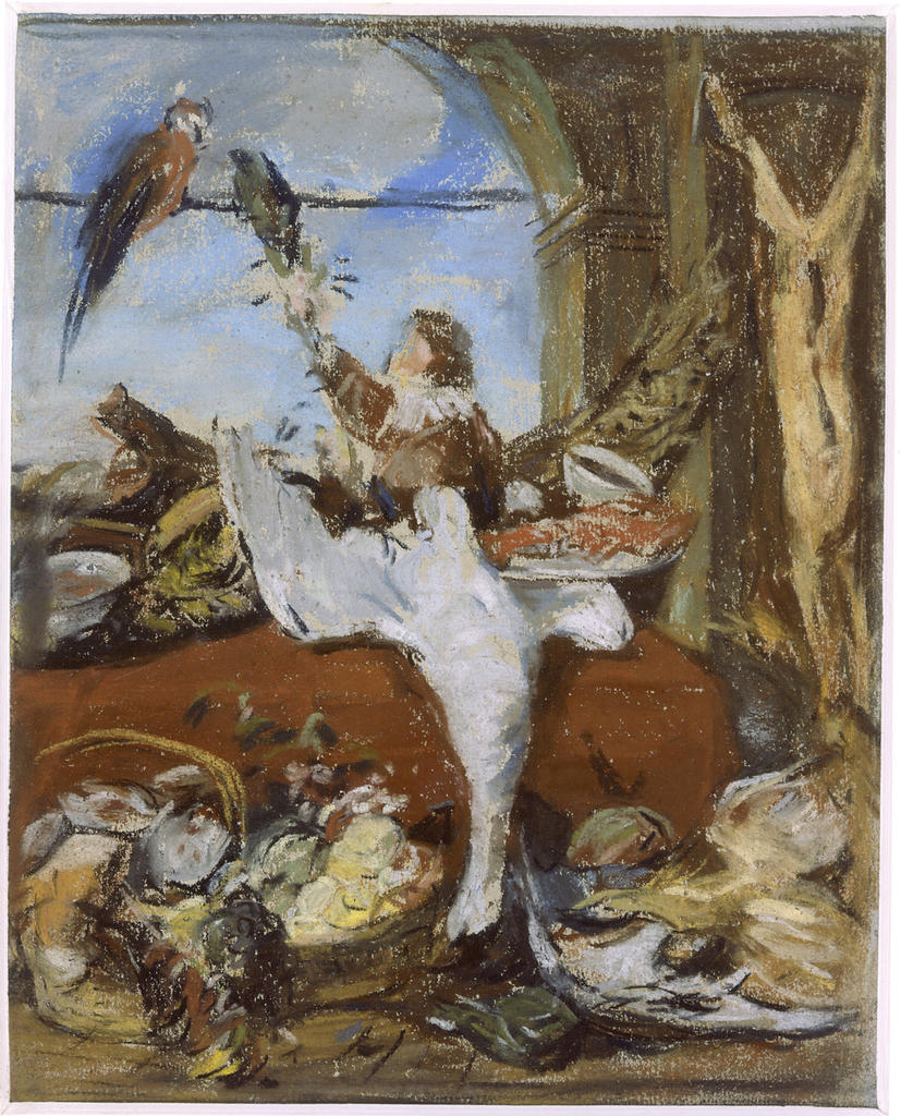 Un florilège de copies réalisées par le jeune Boudin révèle plus loin sa fascination méconnue pour la peinture du XVIIesiècle hollandais et du XVIIIe siècle français. Parti étudier à Paris en 1851 grâce à une bourse de la Ville du Havre, il devient élève-copiste au Louvre, comme en témoigne sa version du Pèlerinage à l’île de Cythère d’Antoine Watteau (1684-1721). Il fréquente aussi le musée des Beaux-Arts de Caen et copie au pastel – technique si prisée du siècle des Lumières – des œuvres comme l’imposant Intérieur d’office de l’Anversois Frans Snyders (1579-1657). Son intérêt pour le peintre des fêtes galantes doit être rapproché des mondaines scènes de plage qui feront son succès.