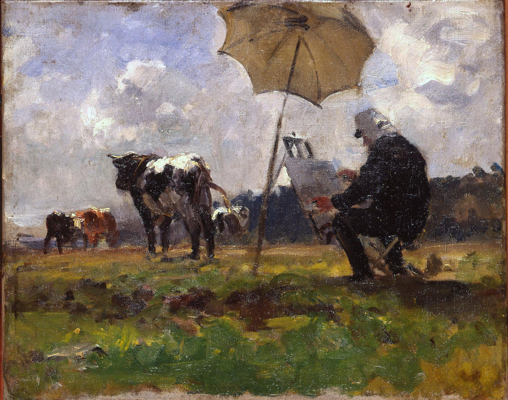 Celui qui inspirera Claude Monet préfère plus que tout travailler sur le motif. L’intérêt qu’il n’a cessé de porter à la lumière, aux nuages et aux effets atmosphériques lui vaudra le surnom de « père de l’impressionnisme », bien que sa palette reste toujours raisonnablement sage. Il participe d’ailleurs à la première manifestation du groupe (1874) et demeurera le compagnon de route des adeptes du plein-air. Son ami Henri Michel-Levy le représente ici à l’ouvrage au milieu d’un pré dans une pochade d’une grande fraîcheur qui témoigne de l’intérêt méconnu de Boudin pour les vaches. Vers 1880, ce sujet lui vaut un certain succès auprès des amateurs, à l’heure où la peinture animalière est notamment remise à l’honneur par Constant Troyon.