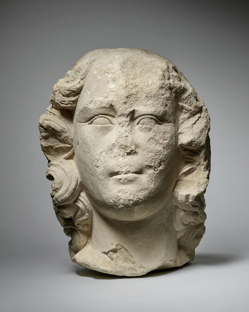Tête d’ange, Notre-Dame de Paris, portail du Couronnement de la Vierge, vers 1210-1220. Calcaire lutétien. Paris, musée de Cluny – musée national du Moyen Âge. Photo service de presse. © Grand Palais Rmn (musée de Cluny – musée national du Moyen Âge) / Mathieu Rabeau