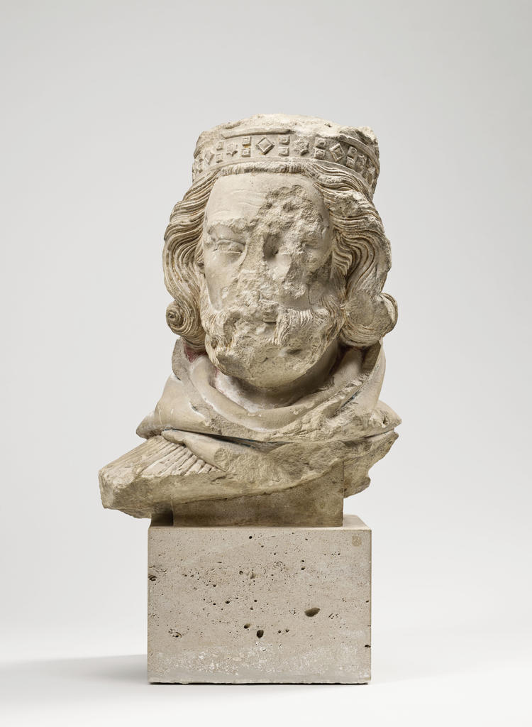 Cette tête a été retrouvée avec d’autres fragments sous la cour de l’hôtel Moreau en 1977. Barbu et couronné, le personnage est identifié à l’un des Rois Mages qui ornaient le portail nord du transept. Le buste conserve des traces de polychromie non négligeables, qui permettent de mieux comprendre son aspect originel : ses cheveux et sa barbe étaient colorés d’ocre rouge, de même que son manteau, dont le revers était rehaussé d’un rouge plus vif. Son vêtement tirait quant à lui davantage vers le brun et sa couronne était rehaussée d’or. Des repeints bleus et verts ont été ajoutés par la suite, peut-être pour apporter à l’ensemble une polychromie plus tranchée.