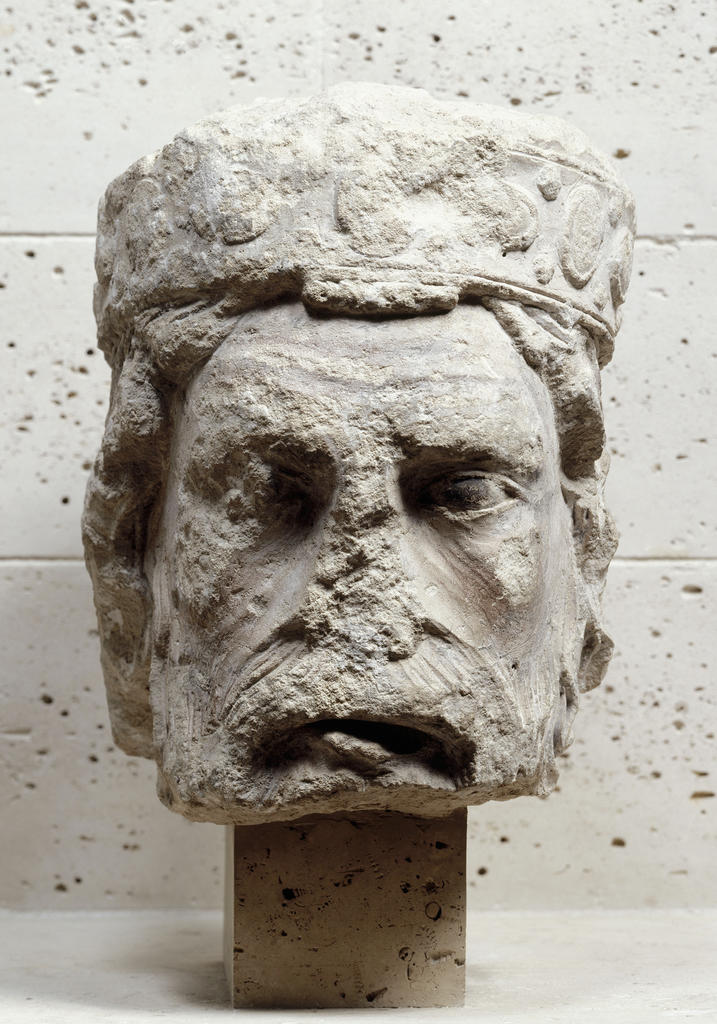 Tête du roi David ou de Pépin le Bref, Notre-Dame de Paris, galerie des rois, vers 1220. Calcaire lutétien, traces de polychromie. Paris, musée de Cluny – musée national du Moyen Âge. Photo service de presse. © Grand Palais Rmn (musée de Cluny – musée national du Moyen Âge) / René-Gabriel Ojeda
