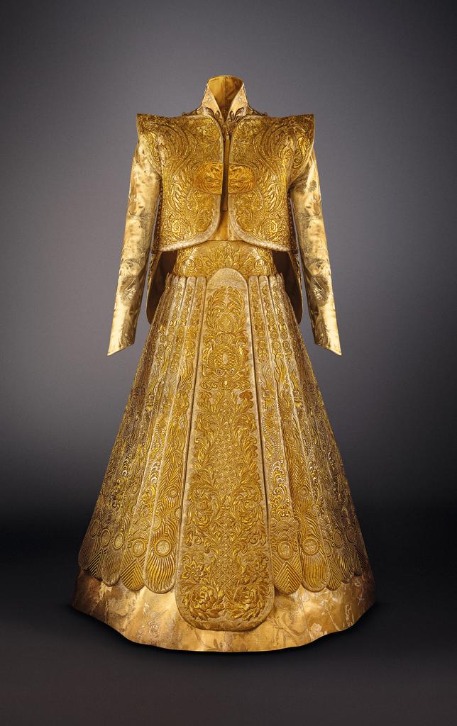 Cette robe de mariée traditionnelle dessinée par la créatrice de mode Guo Pei est un chef-d’œuvre de broderie qui révèle toute la sophistication de la culture chinoise. Elle est ornée d’une trentaine de points de broderie empruntés au monde entier. Ceux-ci donnent vie à des motifs complexes qui sont autant de vœux à l’égard de la future mariée : nuages de bon augure, synonymes d’harmonie et de bonheur conjugal ; courges, symbole de richesse et de bonne fortune ; pivoines, signes de chance et de prospérité ; dragon et phénix, reflets d’une alliance matrimoniale idéale. Cousue à la main avec des fils d’or, cette robe a nécessité cinq ans de travail.