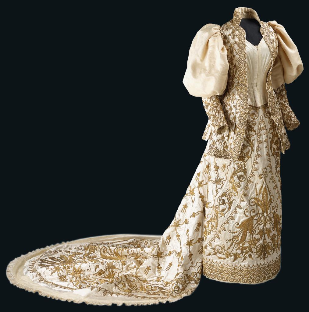 La présence de l’impératrice Eugénie lors de l’inauguration du canal de Suez (1869) donne naissance chez les femmes égyptiennes à un véritable engouement pour la mode occidentale. Cela se traduit par l’adoption de formes européennes, tandis que le travail de broderie fait toujours honneur aux savoir-faire égyptiens. Ce costume de mariage est ainsi décoré selon la technique du dival, proche de l’art pratiqué par les selliers. Les motifs sont réalisés en créant un rembourrage en carton collé sur le textile et recouvert de fils d’or juxtaposés.
