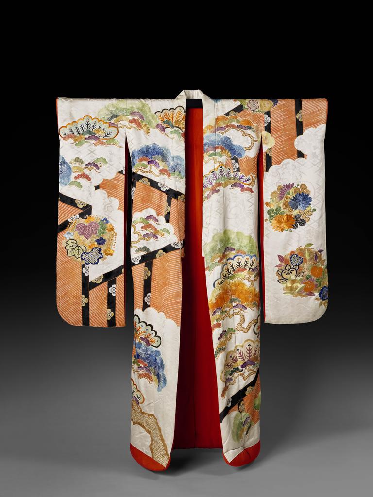 Au Japon, les artisans utilisent de nombreuses techniques pour rehausser les textiles d’or, créant ainsi des vêtements d’un grand raffinement. Les uchikake ou manteaux de mariage, des sur-kimonos qui se portent sans ceinture, font l’objet d’un soin tout particulier. Sur celui-ci, le décor mêle broderies, peinture sur soie et application de feuilles d’or sur un fond de taffetas damassé. Des motifs de pins côtoient des médaillons composés de fleurs de prunier et de feuilles de bambou, synonymes de force et de prospérité, traditionnellement associées au mariage.