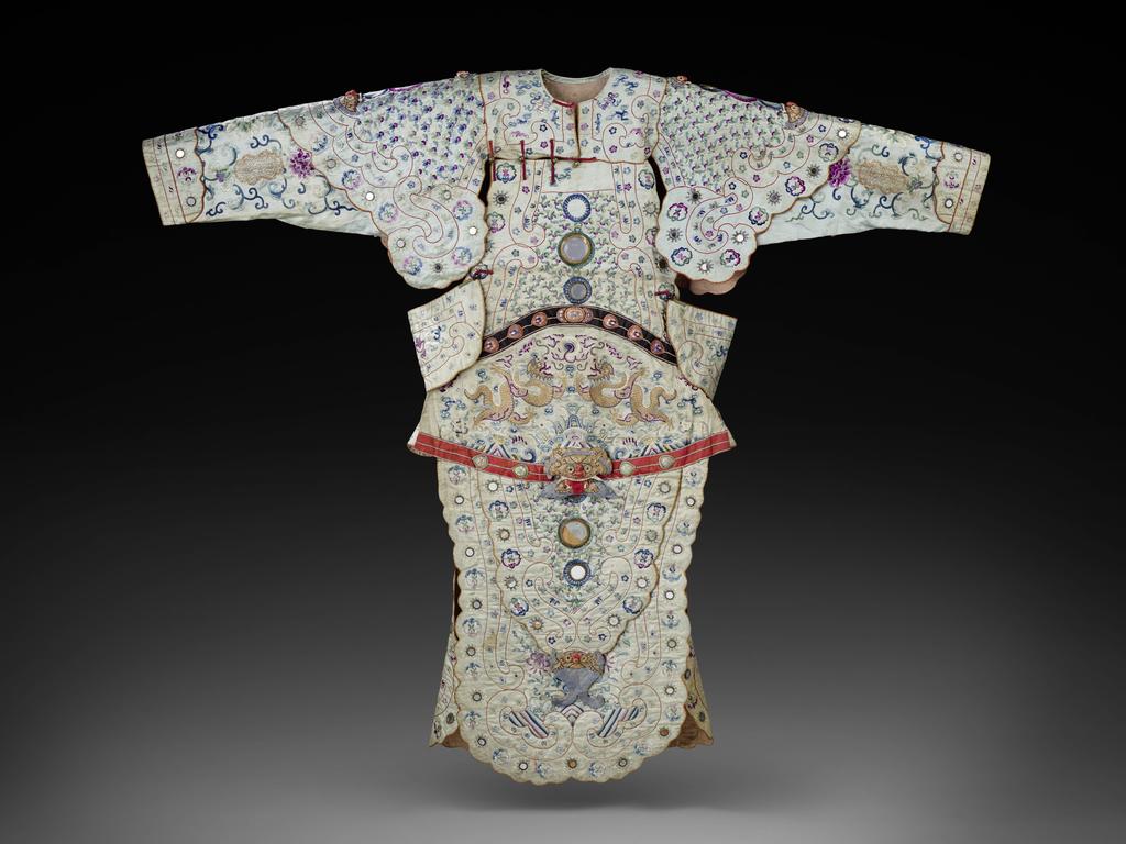En Chine, le rang des dignitaires est indiqué par les motifs qui ornent leurs vêtements. Il en va de même dans le théâtre de Pékin, où chaque typologie de costume est associée à un décor spécifique. On reconnaît ainsi ce costume de guerrière de la garde impériale aux dragons à cinq griffes brodés sur la ceinture. Le décor est notamment réalisé avec des filés dorés et argentés en point de couchure, c’est-à-dire des fils de soie autour desquels sont enroulées de fines lames de métal précieux, qui sont ensuite maintenues sur le tissu par des points de broderie très discrets.