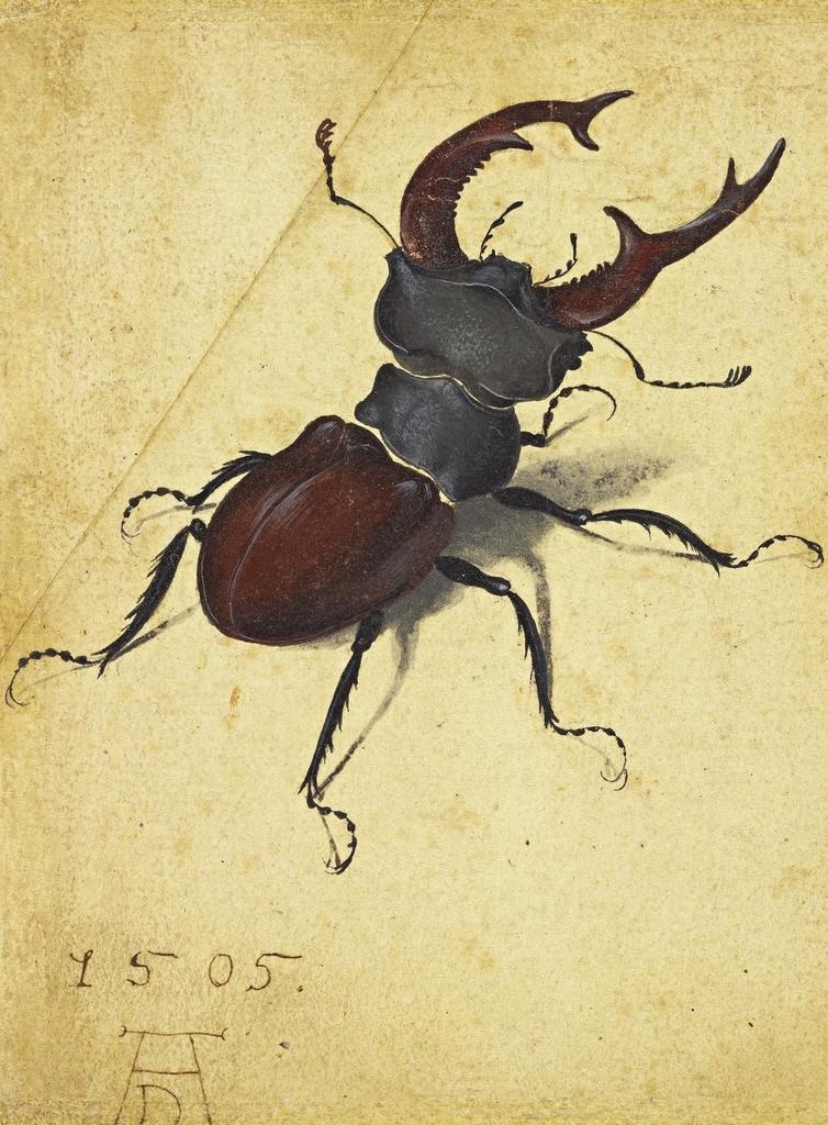 Albrecht Dürer est le premier à figurer de façon aussi naturaliste un insecte en pleine page, conférant à son Lucanus servus le statut d’œuvre d’art à part entière. « Il est bien vrai que l’art est omniprésent dans la nature, et le véritable artiste est celui qui peut le faire ressortir » déclara-t-il. Dessiné avec une précision de scientifique, le coléoptère qui se dresse au-dessus de la feuille donne l’illusion qu’il va se mettre en marche. L’exposition démontre à travers cette œuvre iconique les liens étroits qui se nouent à partir de la Renaissance entre les arts et la science.