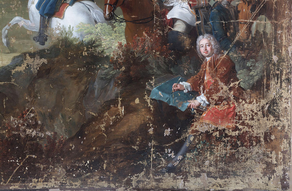 Transférés des Gobelins à Fontainebleau sous Charles X puis encastrés dans les lambris du château sous Louis-Philippe, les tableaux d’Oudry décorent un appartement de prince, rénové pour Louis de France, duc d’Angoulême, et occupé ensuite par les princes d’Orléans, les ducs d’Aumale et de Montpensier, avant d’échoir au petit prince impérial. Agrandis, déplacés, rentoilés ou transposés, les tableaux ont été plusieurs fois restaurés, pour maquiller des lacunes ou des accidents, générant une opacité et une hétérogénéité générale des compositions. Enfin, plusieurs couches de vernis, jaunis par l’oxydation, avaient considérablement assombri la peinture pourtant très lumineuse de l’artiste. Après une phase d’étude préalable, c’est dans l’appartement même où ils sont exposés que fut installé l’atelier de restauration des quatre cartons. Dans la chambre, les restaurateurs du support ont travaillé sur le revers des toiles pour traiter déchirures et déformations, remettre les peintures dans le plan et assurer la bonne adhérence des couches de peinture. Dans le salon, d’autres se sont attelés au nettoyage, au retrait des repeints discordants et à la retouche. Cet ambitieux travail a été confié à un groupement de treize restaurateurs, menés avec brio par Sophie Deyrolle. Ensemble, ils ont permis la renaissance de près de soixante-dix mètres carrés de peinture, 198 chiens et autant de cavaliers. Symbole de la satisfaction suscitée par ce chantier, le visage de l’artiste, en bas à droite du carton bellifontain, était intact sous les repeints successifs. Il a repris toute sa force d’expression et Oudry détourne un instant son regard de la feuille de papier – évidemment bleu – sur laquelle il dessine, pour s’en féliciter, en fixant le spectateur.