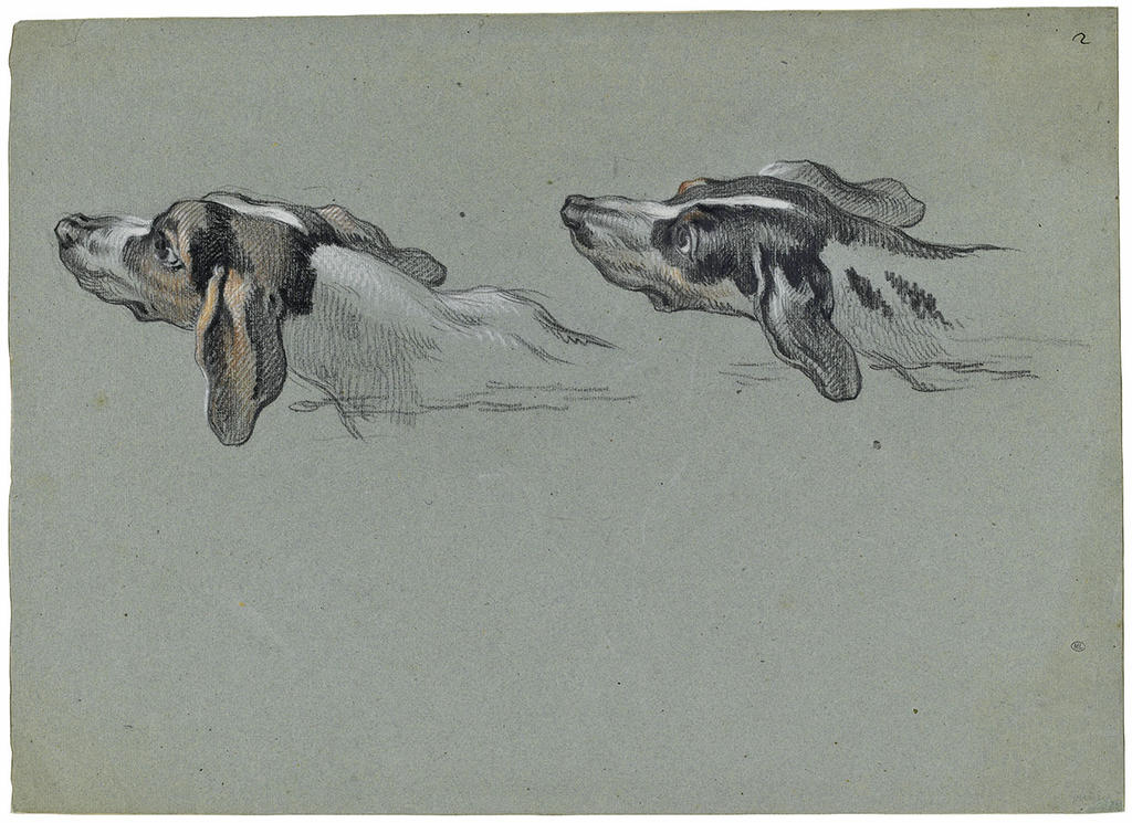 Jean-Baptiste Oudry, Deux Têtes de lévriers tournées vers la gauche, 1728-1735. Pierre noire, rehauts de craie blanche et de pastel sur papier bleu, 32,2 x 44,6 cm. Paris, musée du Louvre, département des Arts graphiques. © Grand Palais-Rmn (musée du Louvre) / Thierry Le Mage