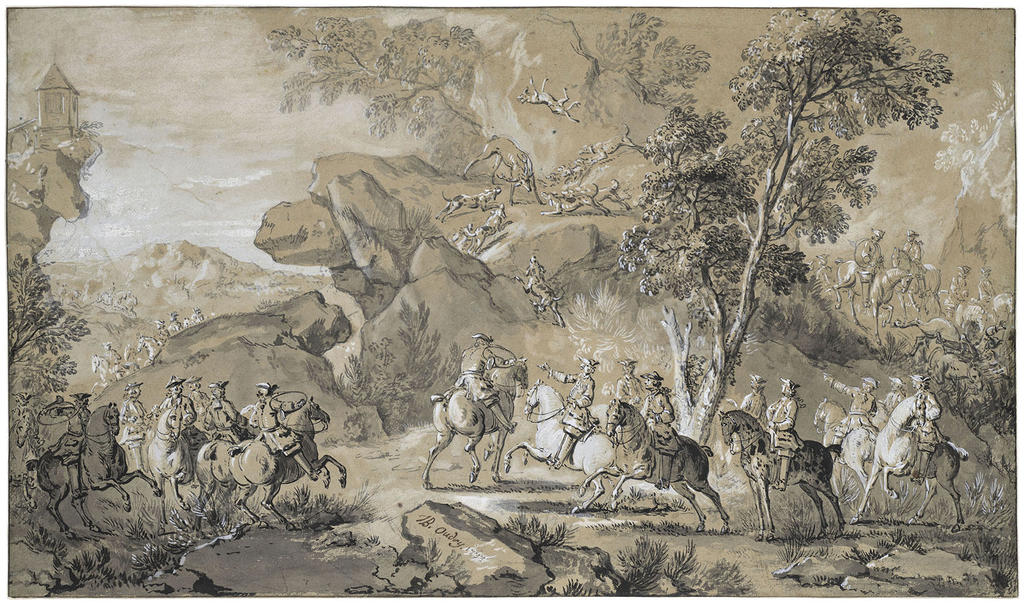 Né à Paris en 1686, Jean-Baptiste Oudry, avant de devenir le peintre animalier que l’on connaît, s’est d’abord illustré dans l’art du portrait et celui de la nature morte. Sa première scène cynégétique, déjà un cerf mis à mort par les chiens (Stockholm, Nationalmuseum), date de 1723. Un pas crucial est franchi en 1724 lorsqu’il peint trois chasses pour la salle des Gardes du château de Chantilly, propriété du prince de Condé, ministre et ami du jeune Louis XV. L’artiste rejoint alors le cercle très restreint des peintres de cour(re), grâce à l’entremise du marquis de Beringhen, premier écuyer du roi. De 1725 à 1732, à la demande du souverain, il exécute onze portraits de ses animaux favoris, des chiens surtout. Il fixe ainsi le profil altier de Polydore, foxhound de la meute royale, comme ceux des élégantes levrettes de la chambre, Misse, Turlu, Mignonne ou Sylvie. Louis XV le convie en 1728 à suivre ses chasses, afin qu’il en tire des compositions pour ses tableaux.