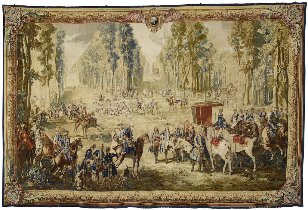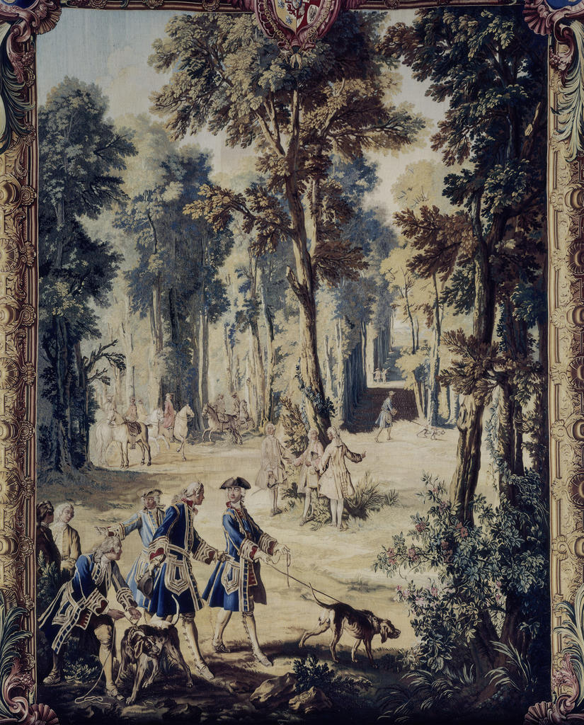 Manufacture royale de tapisserie des Gobelins, atelier de Mathieu Monmerqué, d’après Jean-Baptiste Oudry, Tenture des Chasses de Louis XV, « Louis XV menant le limier, allant aux bois, au carrefour du Puits Solitaire, forêt de Compiègne », 1740-1742. Laine et soie, tapisserie de haute lisse, 432 x 331 cm. Compiègne, musée national du château. © Grand Palais-Rmn (Domaine de Compiègne) / Franck Raux / Thierry Le Mage