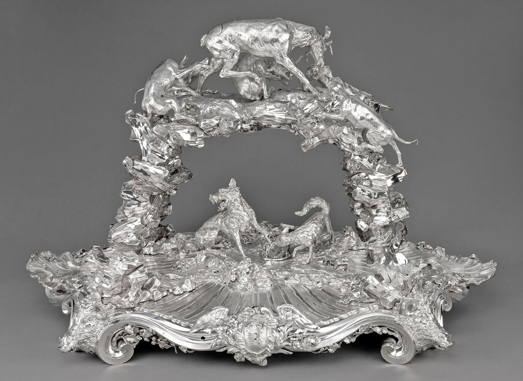 L’objet le plus emblématique de la mode d’Oudry est incontestablement le grand surtout de table en argent exécuté par l’orfèvre Jacques Roëttiers pour le prince de Condé en 1734-1735. Véritable monument d’argent, exceptionnellement prêté par le musée du Louvre, le surtout est comme un précieux miroir de la tenture dirigée par Oudry. L’arche rocailleuse où se déroule le combat évoque immanquablement les rochers de Franchard, parcourus par les chiens, sur le carton de Fontainebleau, peint par Oudry justement dans ces mêmes années. Le loup cruellement pris au piège sur la terrasse est préparé par un dessin de l’artiste, conservé dans les collections des ducs de Mecklembourg-Schwerin.