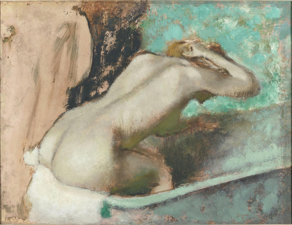 Edgar Degas (1834-1917), Femme assise sur le bord d’une baignoire et s’épongeant le cou, 1880-1895. Peinture à l’huile et à l’essence sur papier marouflé sur toile, 52,2 x 67,5 cm. Photo service de presse. © RMN-Grand Palais (musée d’Orsay) / Hervé Lewandowski