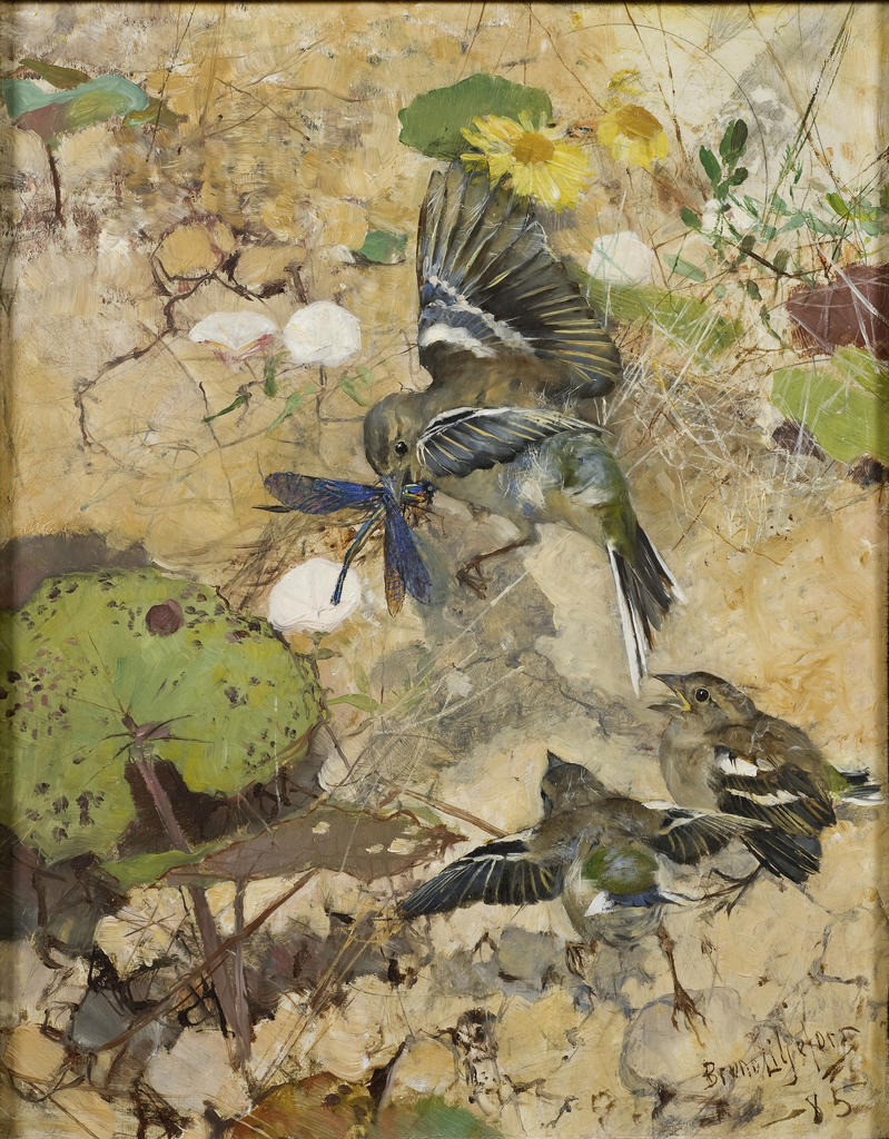Bruno Liljefors, Cinq études d’animaux dans un cadre : Pinsons et libellules (détail), 1885. Huile sur panneau, 33 x 25,5 cm. Stockholm, Nationalmuseum. Photo service de presse. © Stockholm, Nationalmuseum / Photo Cecilia Heisser