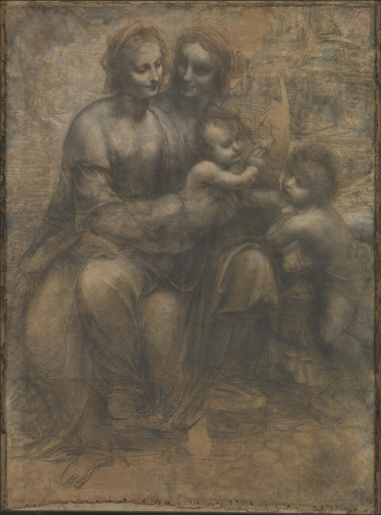Léonard de Vinci (1452-1519), Sainte Anne, la Vierge, l’Enfant Jésus et saint Jean-Baptiste enfant ou Carton de Burlington House, vers 1506-1508. Charbon et craie blanche sur papier, monté sur châssis, 141,5 x 104,6 cm. Londres, The National Gallery.