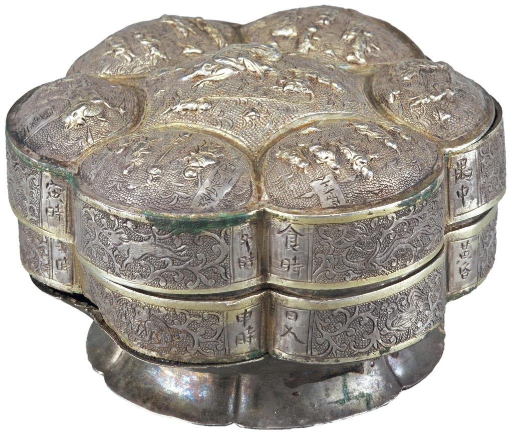 Boîte en argent doré des Sept Royaumes de Du Guan. Argent, H. 5 x D. 7,5 cm. Musée de Xi’an, province du Shaanxi. Musée de Xi’an, province du Shaanxi