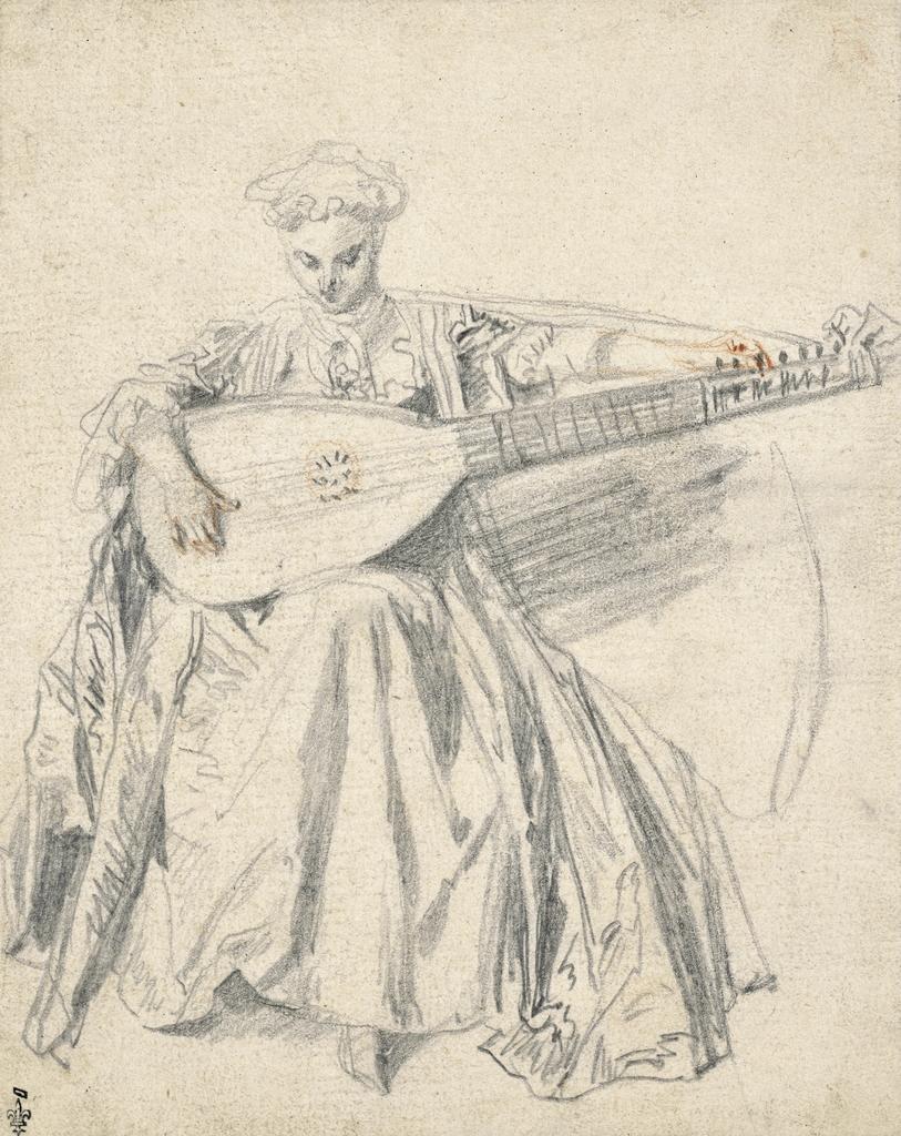 Antoine Watteau, Jeune femme assise accordant un théorbe. Sanguine et graphite, 17,4 x 13,2 cm. Chantilly, musée Condé.