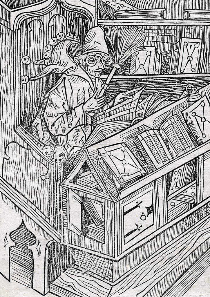 Maître du fou Haintz, Bâle, Johann Bergmann von Olpe, planche découpée du chapitre 1, « De inutilibus libris » (« De l’inutilité des livres »), de Stultifera navis (La Nef des fous) de Sebastian Brant, 1497. Xylographie sur papier, 11,8 × 13,5 cm. Bâle, Musée historique de Bâle. Photo service de presse. © Historisches Museum Basel – P. Emmel