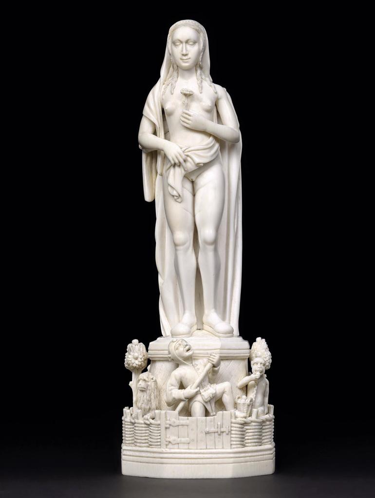 Il ne laisse pas grand-chose intact. L’évolution de la figure vers le thème de la vanité est perceptible dans le parcours, à la fin de la section dédiée au fou et à l’amour. Nous y présentons une très belle statuette en ivoire du premier quart du XVIe siècle. Reposant sur un socle sculpté d’un fou doté de sa marotte dans un jardin d’amour, cette statuette biface présente d’un côté une sorte de Vénus montrant son sexe, de l’autre la Mort sous l’aspect d’un squelette. Elle fait écho à une gravure figurant une belle dame enlacée par la Mort.