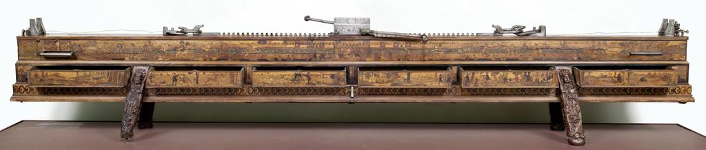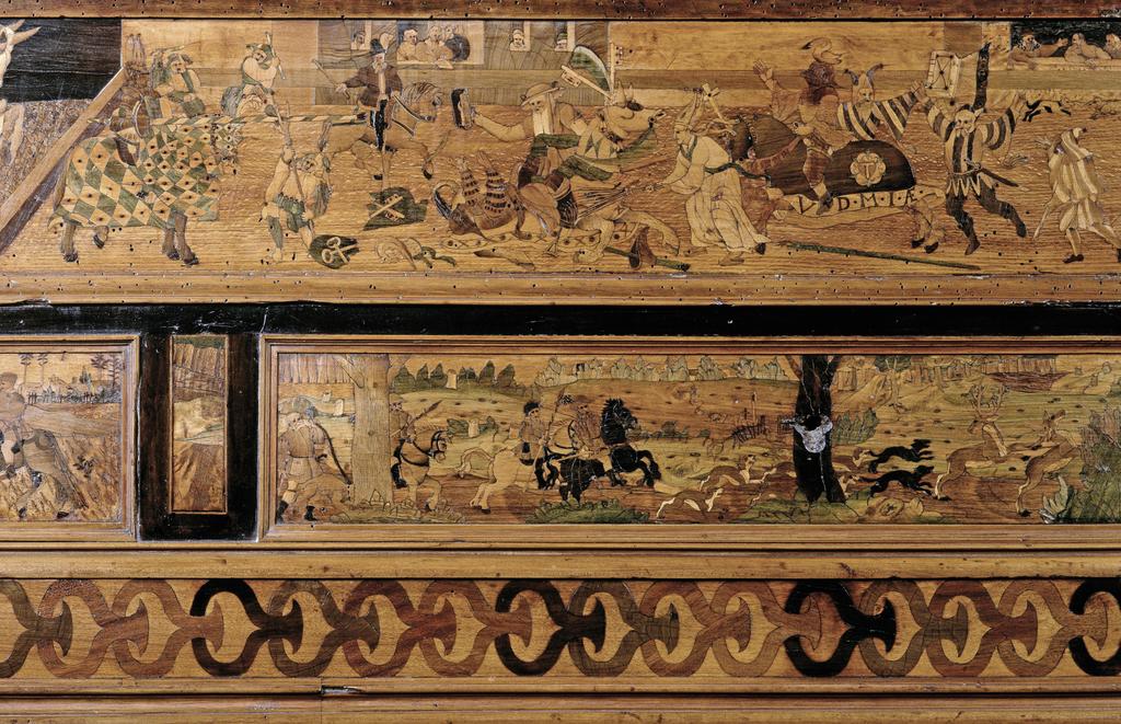 Leonhard Danner, banc d’orfèvre du prince-électeur Auguste Ier de Saxe, 1565. Bois marquetés, acier gravé à l’eau-forte et rehaussé de dorure, H. 42 ; L. 440 cm. Écouen, musée national de la Renaissance – château d’Écouen. © RMN (musée national de la Renaissance, château d’Écouen) – S. Maréchalle