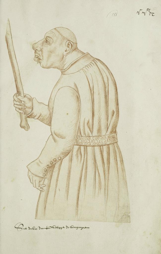 Jacques Le Boucq, Coquinet, sot du duc de Bourgogne, Recueil d’Arras, 1560. Sanguine sur pierre noire, 43 x 31 cm. Arras, Pôle culturel Saint-Vaast / Ronville / Verlaine, Ms. 226, f. 288. Photo service de presse. © Médiathèque de l’Abbaye Saint-Vaast – IRHT-CNRS