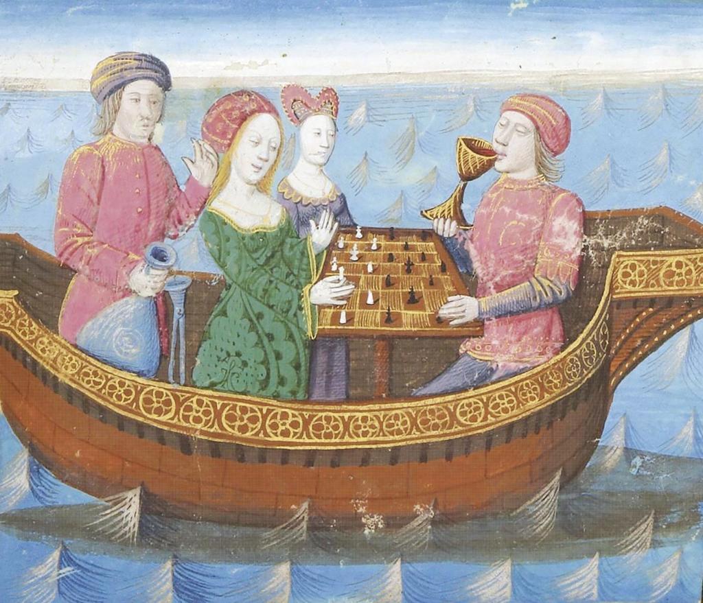 Entourage d’Évrard d’Espinques, Tristan et Iseut buvant le philtre d’amour, Roman de Lancelot, Centre de la France, vers 1470. Détail. Enluminure sur parchemin, 43 x 30 cm. Paris, Bibliothèque nationale de France, Ms Français 112, t. I, f. 239r. Photo BnF