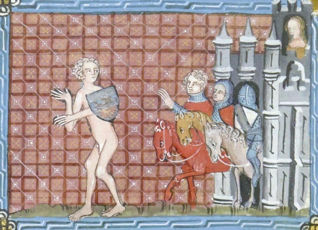Folie de Lancelot fuyant, nu, la colère de Guenièvre, Lancelot-Graal, Tournai, 1345. Détail. Enluminure sur parchemin, 41 x 31,5 cm. Paris, Bibliothèque nationale de France, Ms Français 122, f. 211v. Photo BnF