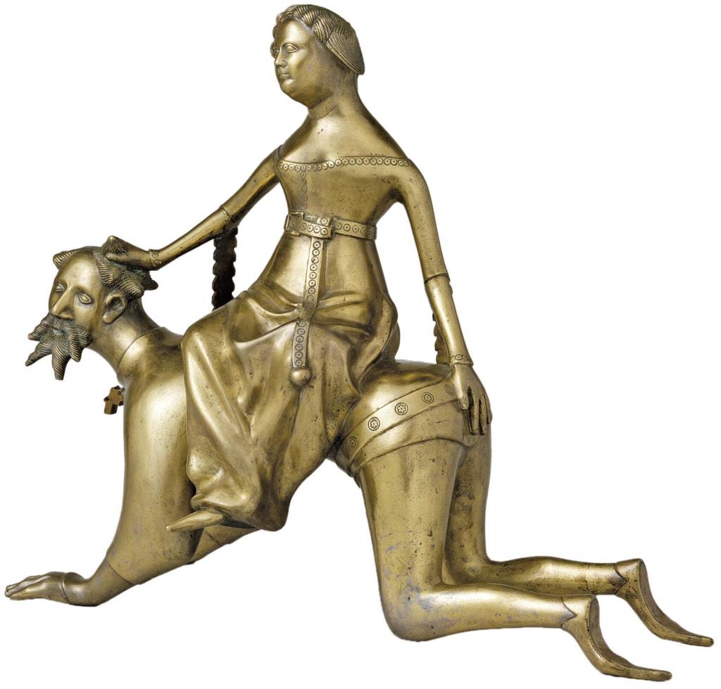 Dans la version germanique, plus grinçante et plus misogyne, le philosophe, insulté par une Phyllis triomphante, s’enfuit, honteux, méditant sur la malice et la rouerie féminines. La subjugation d’Aristote devint un topos (lieu commun) de la culture médiévale et de la Renaissance. Les chrétiens n’étaient sans doute pas mécontents de voir ainsi ridiculisé et aveuglé par l’amour le plus prestigieux des philosophes païens (Platon mit du temps à lui disputer ce titre). Des éléments plus troubles, qui ont fait le bonheur des psychanalystes, entrent aussi en jeu dans cette histoire d’humiliation amoureuse « équestre ». C’est surtout le sexisme foncier de la période et l’admonestation contre le risque de domination des femmes contenue dans l’anecdote qui assurèrent le succès de cette dernière. On retrouve Phyllis sur le dos d’Aristote dans le décor de nombre d’objets du quotidien (comme le superbe aquamanile présenté dans l’exposition du musée du Louvre et une série de coffres en ivoire, possibles cadeaux de mariage). Le couple apparaît plus tard dans des gravures de la Renaissance, allemande surtout (Matthäus Zasinger, Hans Baldung Grien, Georg Pencz, etc.), lesquelles exploitent l’érotisme scabreux d’une situation qui est aussi une occurrence frappante du riche thème du « monde renversé ».