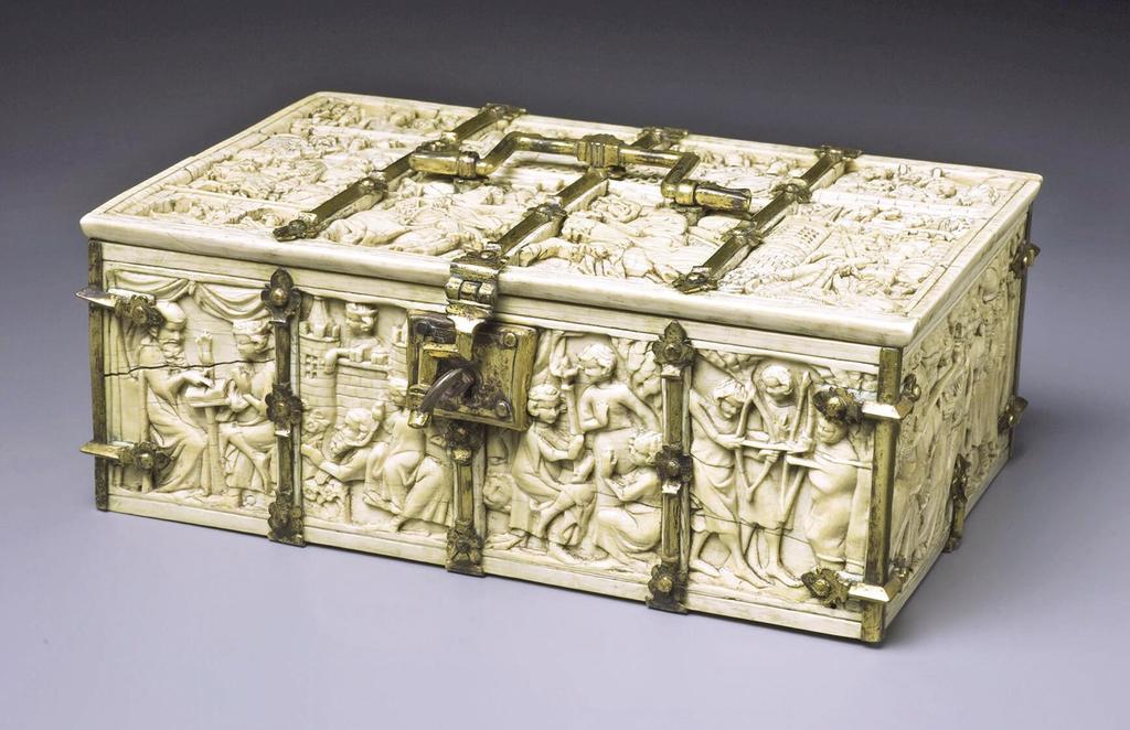 Coffret composite, Paris, vers 1300-20. Scènes représentées : attaque du château d’Amour, exploits de Gauvain et Lancelot, histoire d’Aristote et Phyllis, chevalier défendant une pucelle enlevée par un homme sauvage, l’ermite remettant à Galaad les clefs du château des Pucelles, épisode apocryphe de la sagesse du roi Salomon, deux scènes de l’histoire de Tristan et Iseut. Ivoire d’éléphant, H. 9,7 ; L. 25,7 ; P. 16,7 cm. Paris, musée de Cluny – musée national du Moyen Âge. Photo service de presse © RMN (musée de Cluny – musée national du Moyen Âge) – M. Urtado