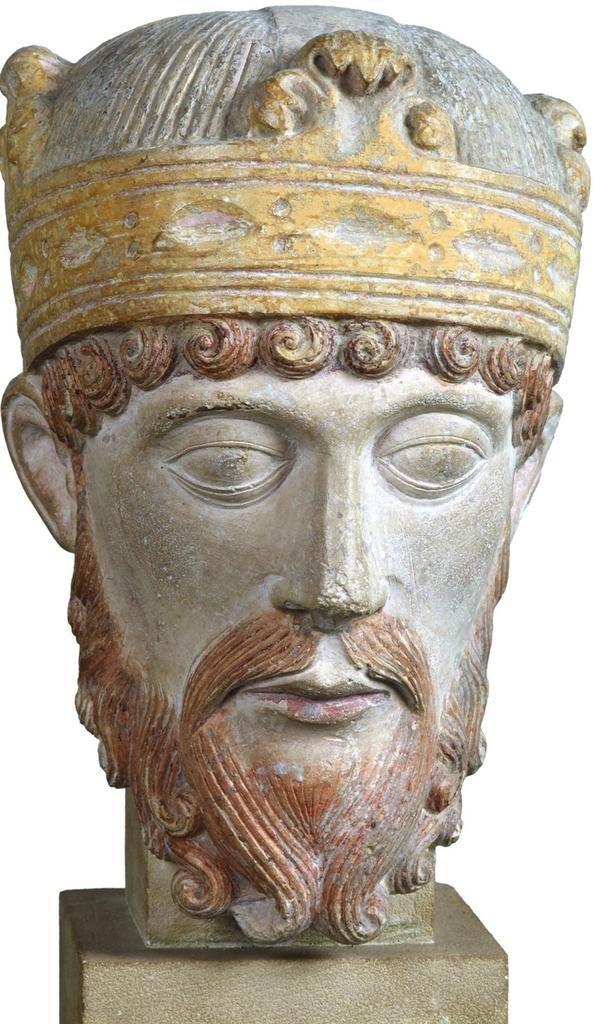 Portrait dit de Lothaire. Calcaire polychrome, XIIe siècle. Découvert en 1919 lors de fouilles effectuées dans la basilique Saint‑Remi. © Reims, musée Saint‑Remi
