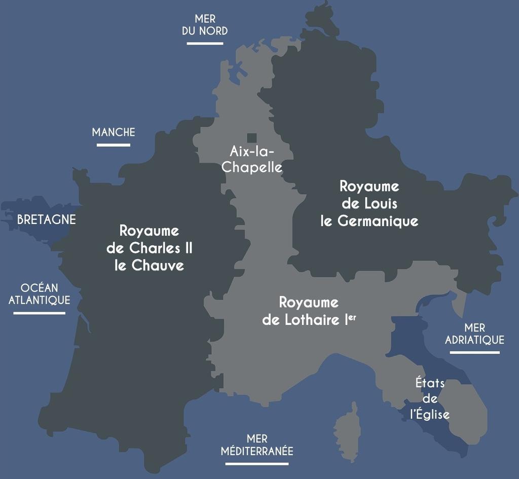 Carte de répartition de l’Empire carolingien après le traité de Verdun. © Éditions Faton