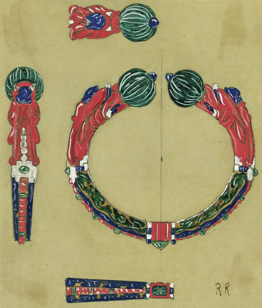 Un gouaché est un dessin très abouti, séduisant, que l’on peut présenter à un client potentiel. C’est également un document de référence pour les ateliers, compréhensible des praticiens, qui vont alors le traduire en trois dimensions. On retrouve ainsi sur cette gouache de la maison Cartier une vue d’ensemble du bracelet et plusieurs détails qui permettent d’en percevoir toutes les faces. On y devine toute la passion de Cartier pour l’Extrême-Orient et ce goût précurseur pour les lignes Art déco.