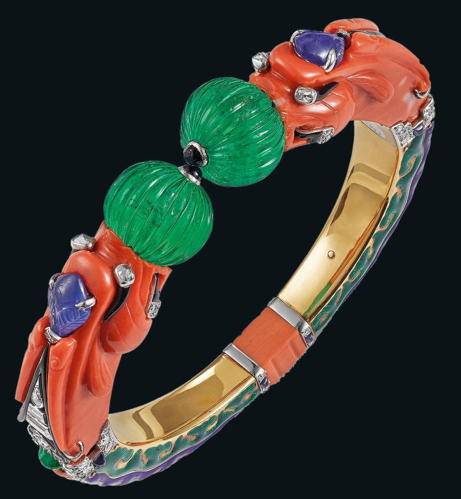 Cartier Paris, bracelet rigide Chimères, 1928. Or émaillé, corail sculpté, saphirs, diamants, émeraudes, onyx, 7,4 x 8,15 x 1,60 cm. Paris, Collection Cartier. Photo service de presse. © Cartier / photo Nick Welsh
