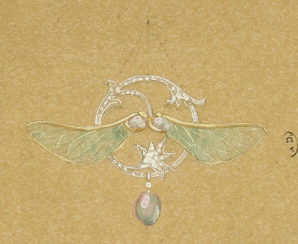 Georges Fouquet entame une collaboration féconde avec le dessinateur Charles Desrosiers, à l’origine de nombreux bijoux entre 1898 et 1910. Fervent adepte de l’Art nouveau, il puise son inspiration dans la nature, soit de manière très littérale en citant un motif végétal ou animal, soit de manière plus subtile, à travers un effet de texture par exemple. La graine de sycomore qui constitue le motif central de ce pendentif n’est pas sans évoquer également les ailes diaphanes d’une libellule, un animal très apprécié des joailliers Art nouveau.