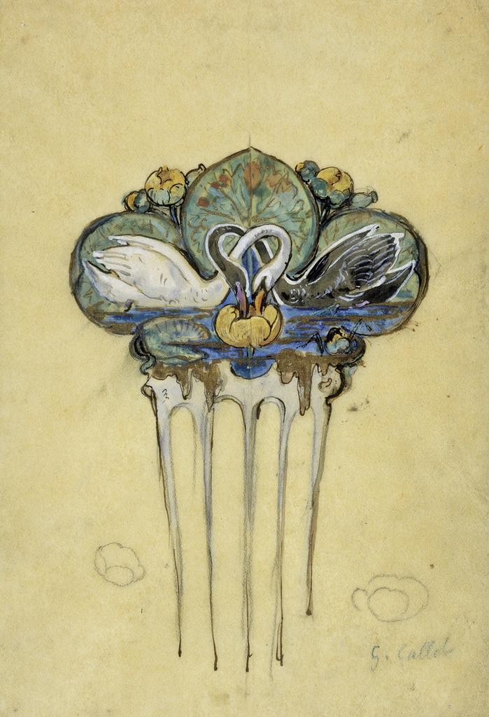 Georges Callot (1857-1903), dessin d’après le peigne Cygnes et nénuphars, vers 1900. Encre noire, papier calque, gouache, crayon graphite, 23 x 14,8 cm. Petit Palais, musée des Beaux-Arts de la Ville de Paris. Photo service de presse. Photo CC0 Paris Musées / Petit Palais