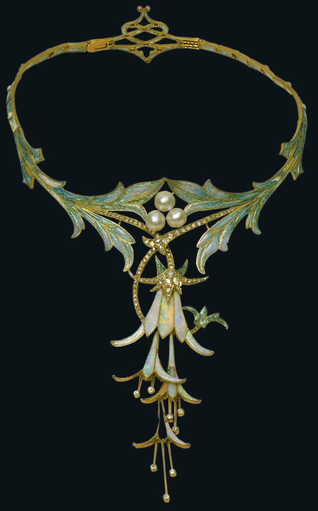 En 1895, Georges Fouquet reprend la maison de joaillerie fondée par son père et devient l’un des principaux représentants de l’Art nouveau naissant. Il a souvent recours aux émaux, dont il apprécie la transparence et la délicatesse des couleurs. Il les associe fréquemment à l’opale, une pierre aux reflets changeants, et aux perles baroques aux contours irréguliers. On retrouve dans le collier les moindres détails dessinés par Desrosiers sur son projet.