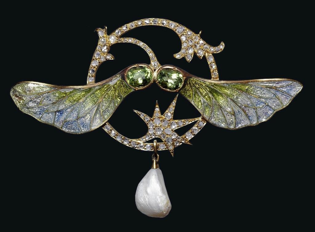 Après avoir travaillé comme dessinateur pour Cartier, Fouquet, Vever ou Boucheron, René Lalique expose des bijoux en son nom à partir de 1895. Il embrasse alors pleinement le courant Art nouveau, qui cherche à abolir la hiérarchie entre les beaux-arts et les arts décoratifs. C’est dans cette optique que le joaillier utilise volontiers des matériaux comme la corne, les pierres fines ou la pâte de verre, qu’il affectionne tant, au détriment des pierres précieuses.