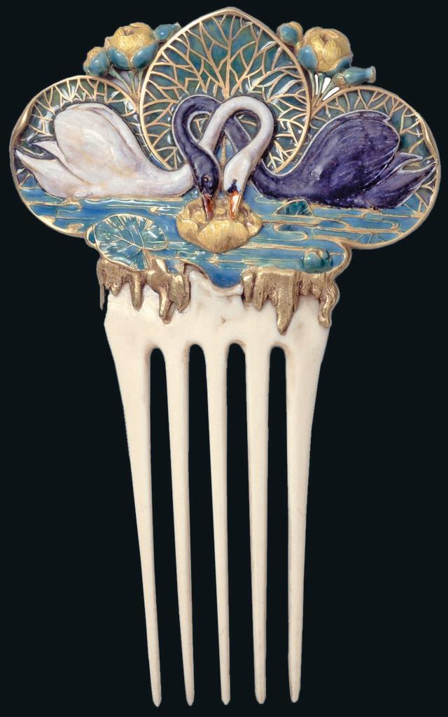Vever Frères, d’après un modèle d’Eugène Grasset (1845-1917), peigne Cygnes et nénuphars, vers 1900. Ivoire, or repoussé, émail cloisonné translucide et opaque, 15,5 x 9,5 x 0,5 cm. Petit Palais, musée des Beaux-Arts de la Ville de Paris. Photo service de presse. Photo CC0 Paris Musées / Petit Palais