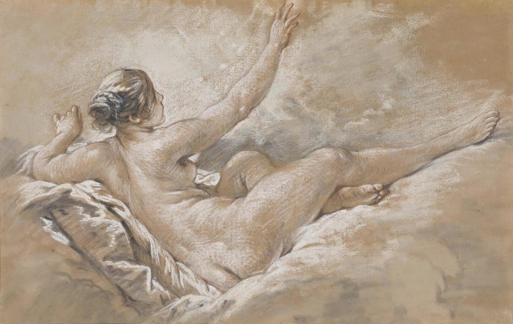 François Boucher (1703-1770), Danaé recevant la pluie d’or. Crayon noir sur traits de sanguine, craie blanche et estompe, rehauts de pastel bleu sur papier beige, 30 x 47 cm. Vente Paris Drouot, Daguerre, 28 mars 2025. Expert : Cabinet de Bayser. Estimé : 30 000/50 000 € Adjugé : 48 100 € (frais inclus). © Drouot / Daguerre