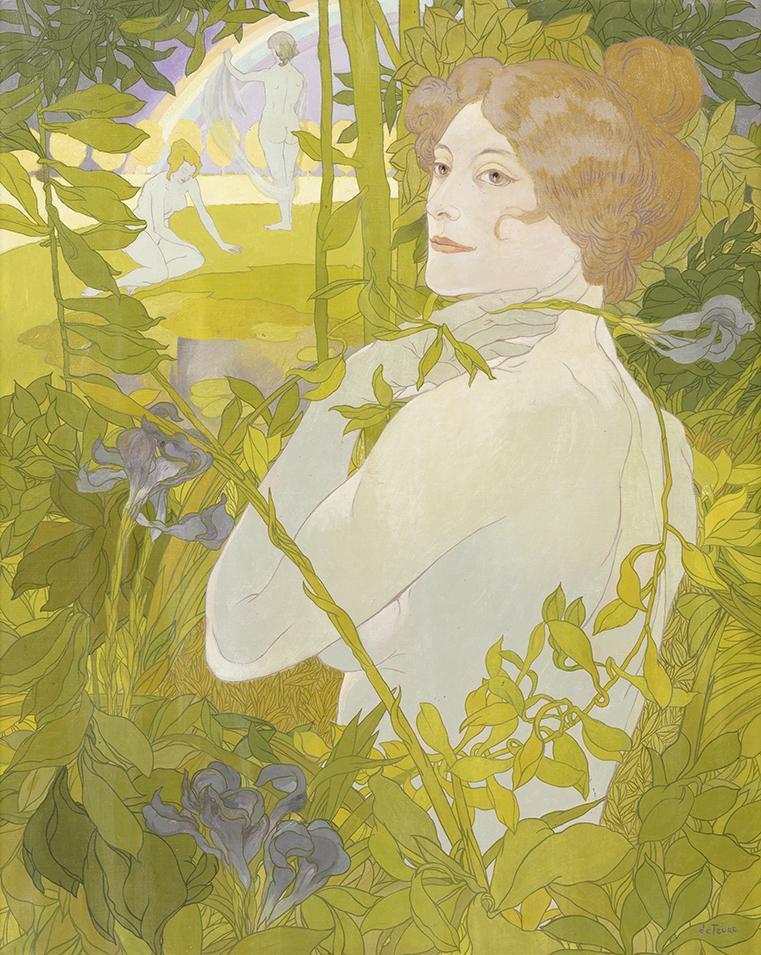 Le succès fut au rendez-vous pour un important ensemble d’une trentaine d’œuvres du symboliste Georges de Feure, inclus dans la vente de tableaux anciens et du XIXe siècle de Sotheby’s. Femme à l’iris illustre avec brio la propension de l’artiste à associer les femmes à des motifs floraux alors que l’Art nouveau promouvant les formes végétales est en plein essor au cours des années 1890. L’œuvre pictural du peintre fut aussi largement influencé par les poèmes de Baudelaire, en particulier Les Fleurs du Mal. Traditionnellement, le thème de la femme fatale impliquait la représentation d’une créature au teint diaphane et à la longue chevelure ondoyante prête à ensorceler les hommes, mais le peintre a pris ici pour modèle sa future épouse, Marguerite Guibert, décrite comme une divinité tenant l’attribut traditionnel de la déesse Iris.