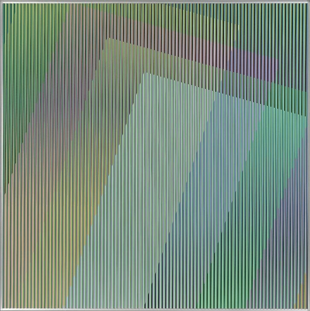 Carlos Cruz-Diez (1923-2019), Physichromie N°2818, Paris, 2019. Chromographie sur aluminium, lamelles de plastique, 100 x 100 cm. Vente Paris, Bonhams Cornette de Saint Cyr, 5 décembre 2024. © Adagp, Paris, 2025