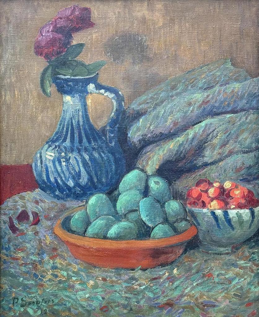 Cette nature morte aux couleurs acidulées de Paul Sérusier a séduit les amateurs dans une vente consacrée aux écoles bretonnes à Brest. La toile date du début de l’année 1912, époque où le peintre du Talisman a pris ses distances avec ses amis nabis (principalement Bonnard, Vuillard, Maurice Denis et Paul-Élie Ranson) pour prendre un chemin plus personnel. Il vient alors d’épouser l’une de ses élèves de l’académie Ranson – où il enseigne depuis 1908 –, Marguerite Gabriel-Claude, également artiste peintre. Sérusier, qui a fait son apprentissage à Pont-Aven avec Gauguin, restera toujours très attaché à la Bretagne où il s’installe définitivement en 1914.