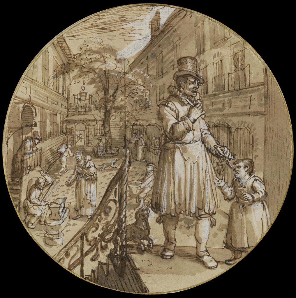 Récemment redécouvert, ce précieux dessin de David Vinckboons n’était jamais apparu sur le marché. Décrivant ce qui pourrait s’apparenter à une scène de genre, il peut s’interpréter comme une allégorie de la Forge car y apparaissent divers éléments ayant trait au métal (balustrade, grille en fer, couteau et un forgeron au travail). Ce petit tondo exécuté à l’encre brune fait partie d’un ensemble de dessins d’emblèmes commandés à l’artiste par le théologien protestant et peintre héraldique Paulus de Kempenaer, probablement dans l’intention d’une publication gravée. Réfugiés dans les Pays-Bas du Nord accueillant les communautés de réformés, les deux artistes ont étroitement collaboré en 1612-1613. Des annotations manuscrites de Kempenaer sont d’ailleurs visibles sur la marge du dessin et au verso.