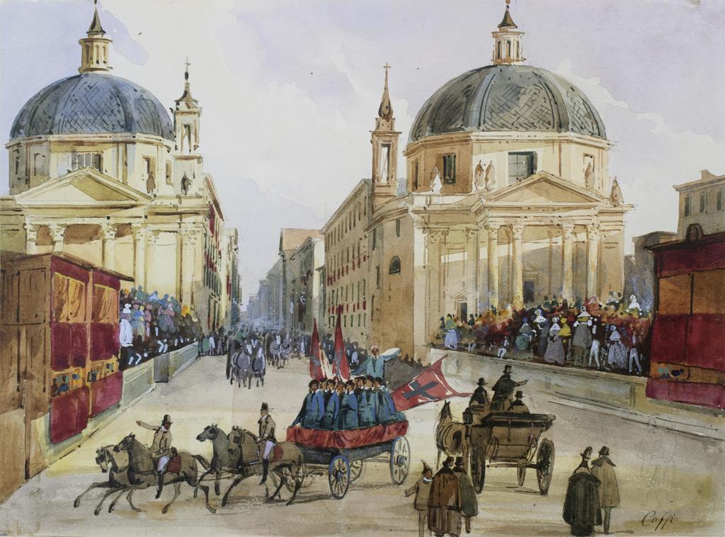 Récemment redécouverte par la galerie romaine Antonacci, cette aquarelle inédite d’Ippolito Caffi décrit un événement phare du carnaval de Rome, la course de chevaux libres, dite course de Barberi qui avait lieu le long de la via del Corso, entre la Piazza del Popolo et la Piazza Venezia. Extrêmement populaire, le carnaval de Rome fut jusqu’à la fin du XIXe siècle l’une des manifestations les plus spectaculaires et les plus festives d’Europe. Sa course de chevaux libres a été immortalisée par de nombreux peintres, de Théodore Géricault à Horace Vernet ; elle fut même relatée par Alexandre Dumas dans un passage du Comte de Monte-Cristo. Mais l’aquarelle de Caffi a la particularité de traiter un épisode rarement représenté, celui des derniers préparatifs avant le départ de la course. L’artiste choisit ici de transcrire l’excitation du moment, en montrant l’attelage des Gardes suisses finissant de faire place nette avant le passage des chevaux.