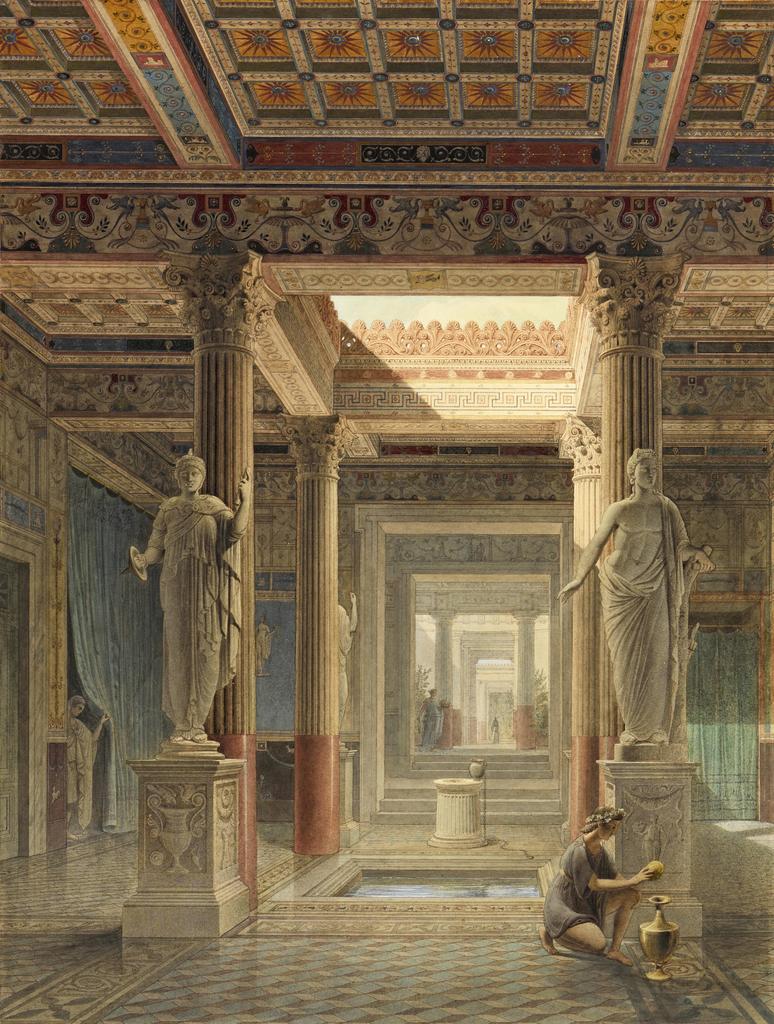 Jules-Frédéric Bouchet (1799-1860), Fantaisies architecturales : l’atrium de la maison de campagne de Pline le Jeune, 1850. Plume, encre de Chine et aquarelle, 53,5 x 43 cm. © galerie Terrades – Paris