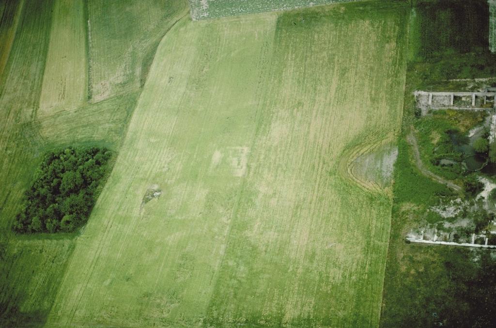Photographie aérienne du site archéologique d’Aquae Segetae, avec traces du temple conservé en sous-sol, 1979. © Daniel Jalmain