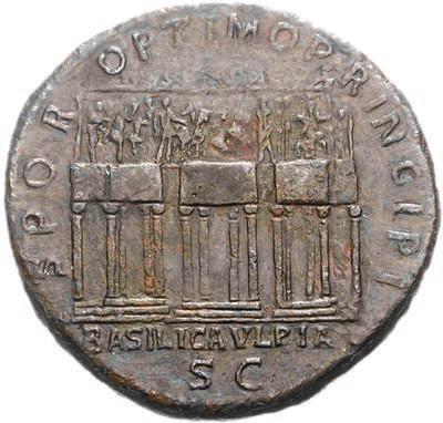 Sesterce de Trajan, figurant au revers la façade de la basilica Ulpia. DR